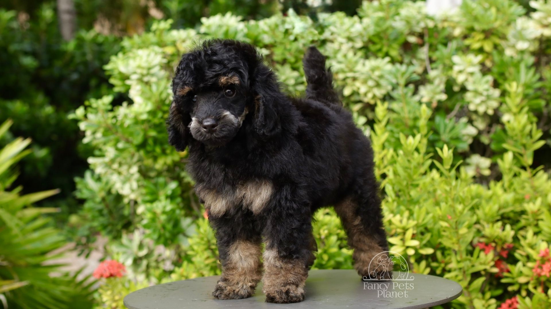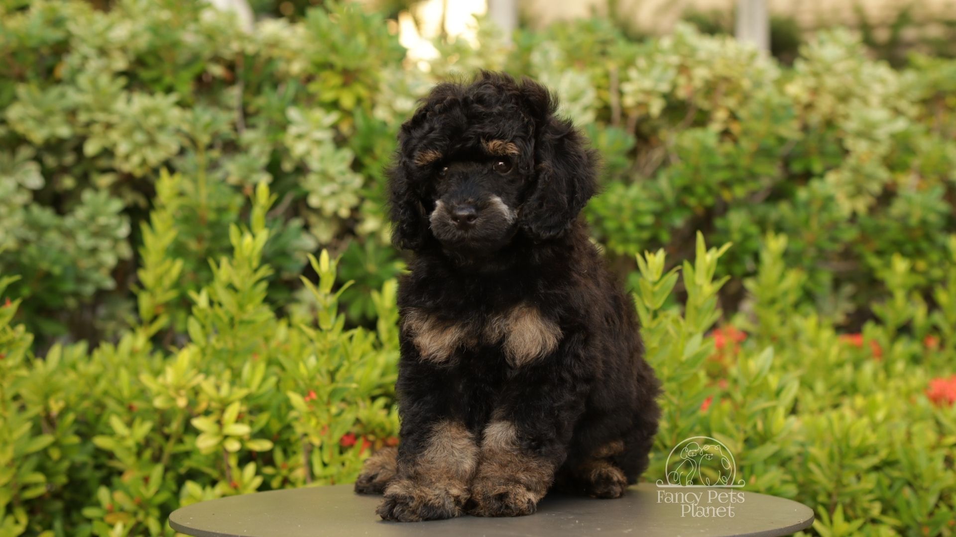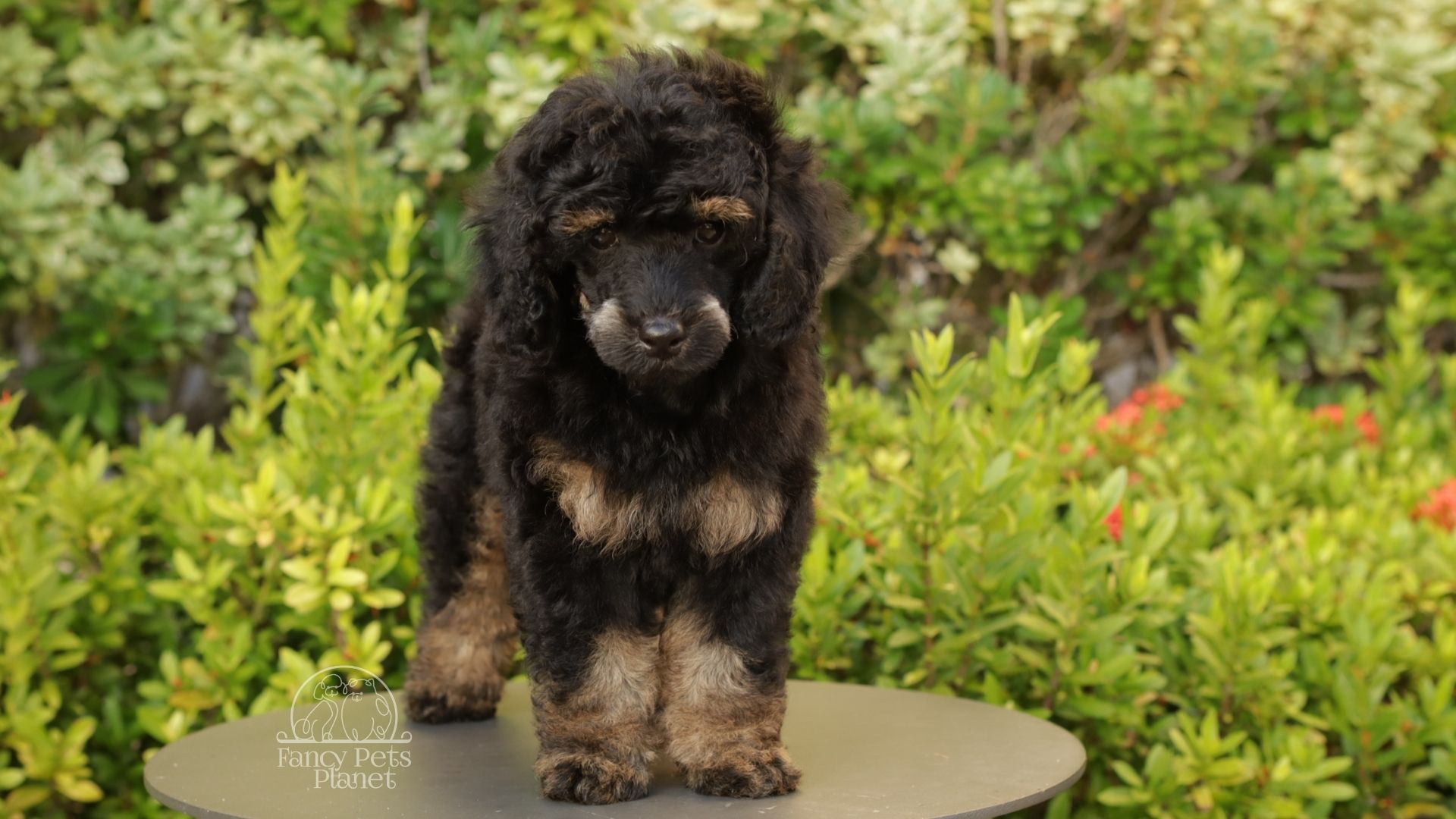 Meet Carlos, a beautifully marked black phantom Toy–Mini Poodle, estimated to reach up to 11 inches and up to 8 lbs full grown — the perfect in-between size for families. Not too big, not too small, right in that ideal range for a calm, affectionate companion.