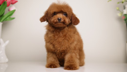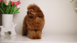 Charming Lou is a 7-month-old female Toy Poodle with a rich mahogany red coat and a fluffy teddy-bear appearance. She has a correct, well-balanced structure with excellent proportions.