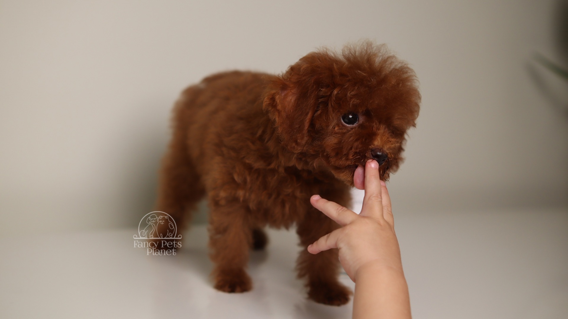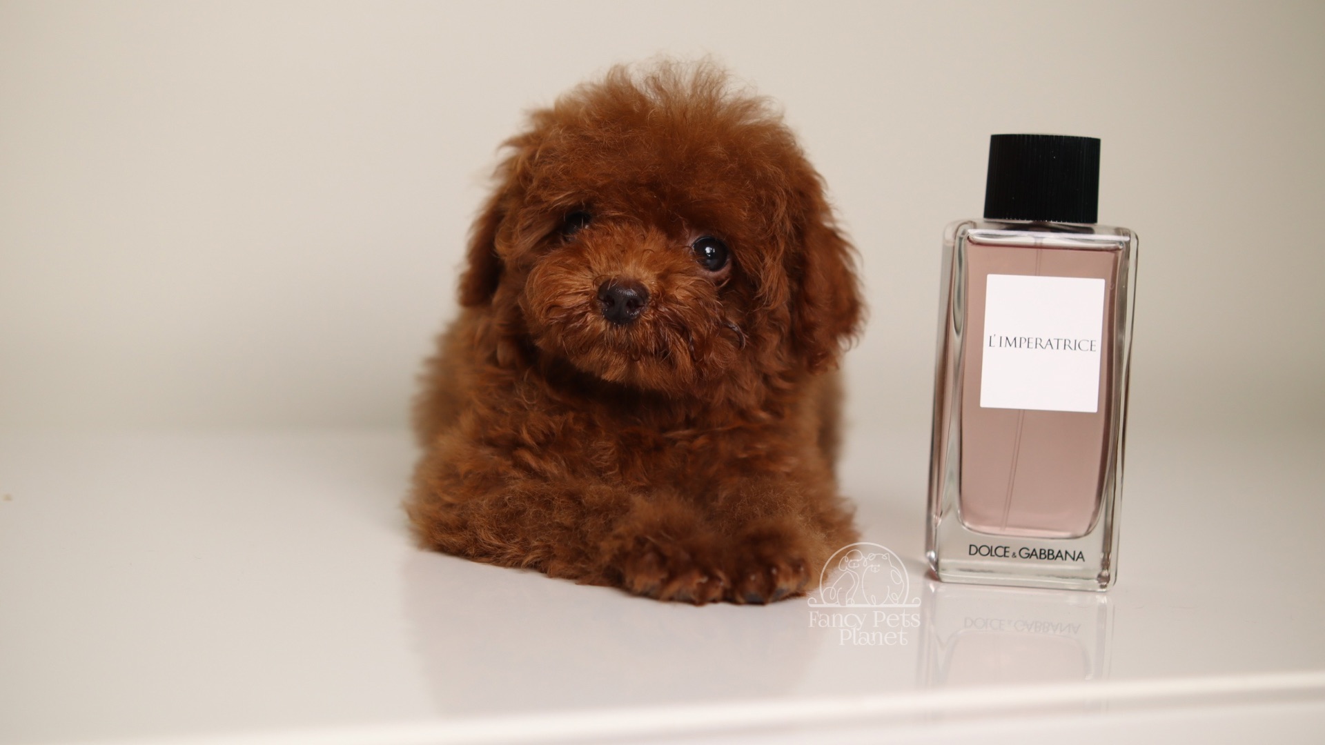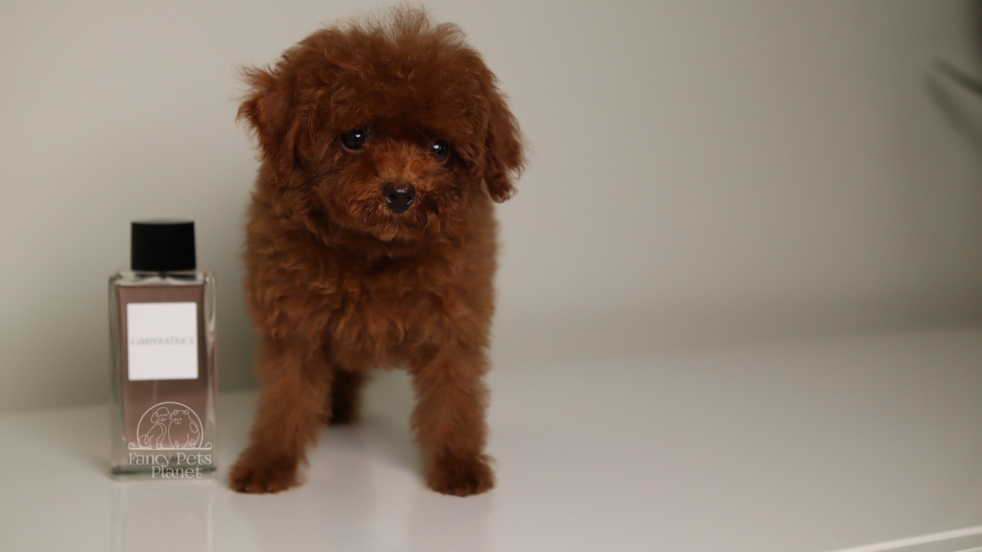 Giselle is a breathtaking deep cherry red Toy Poodle with a short face, baby-doll expression, and thick, well-textured fur. She has a square, compact build and correct proportions that perfectly represent elite Chinese import quality.