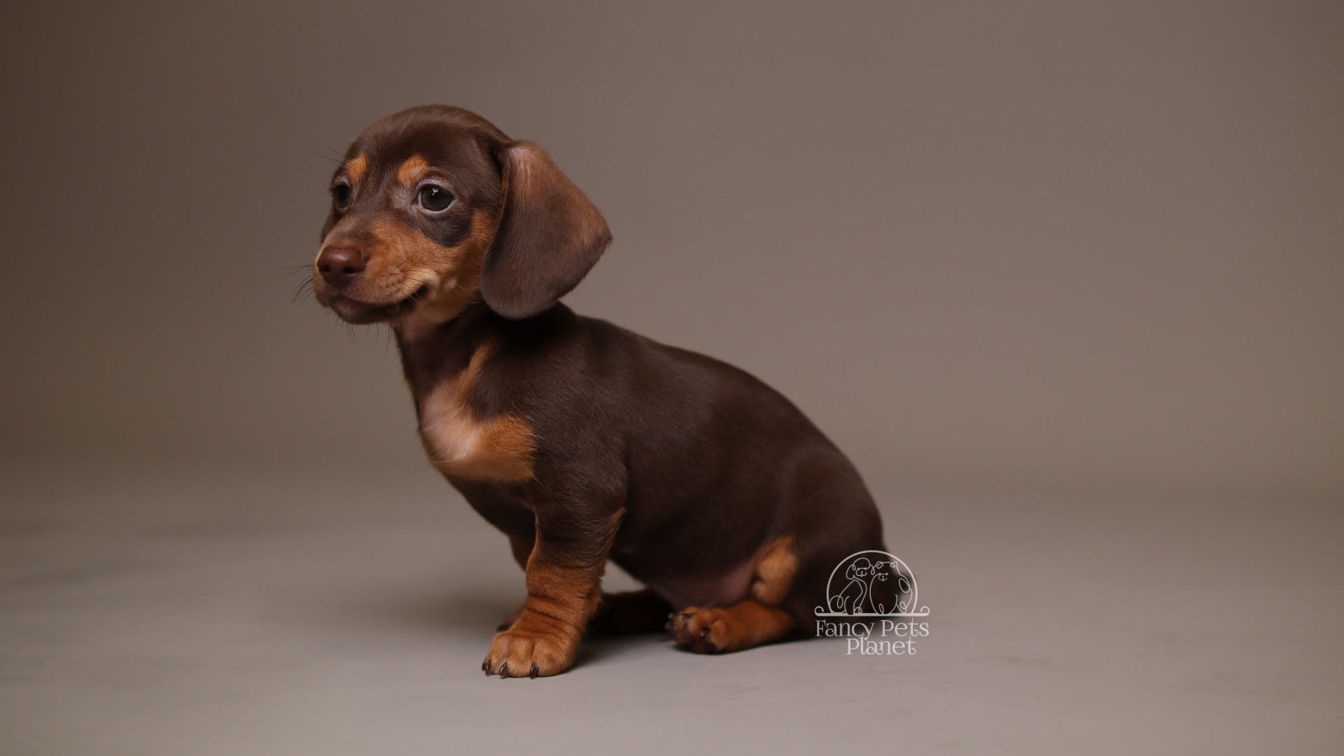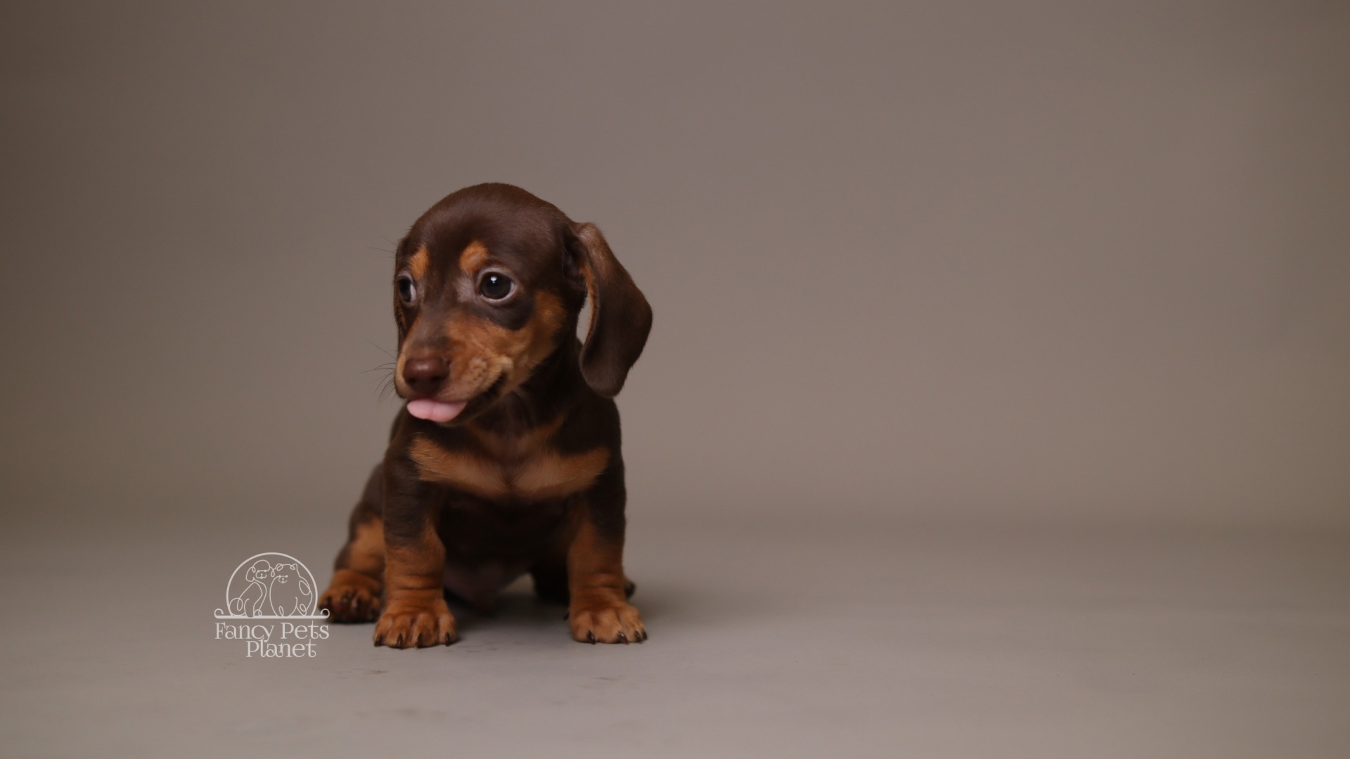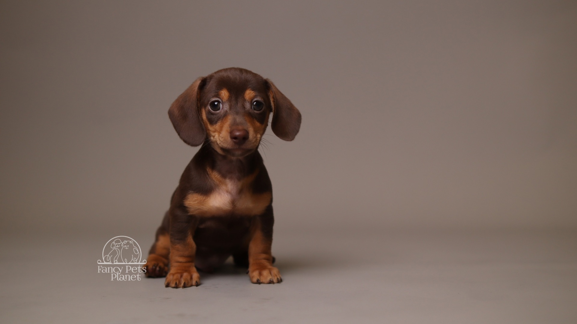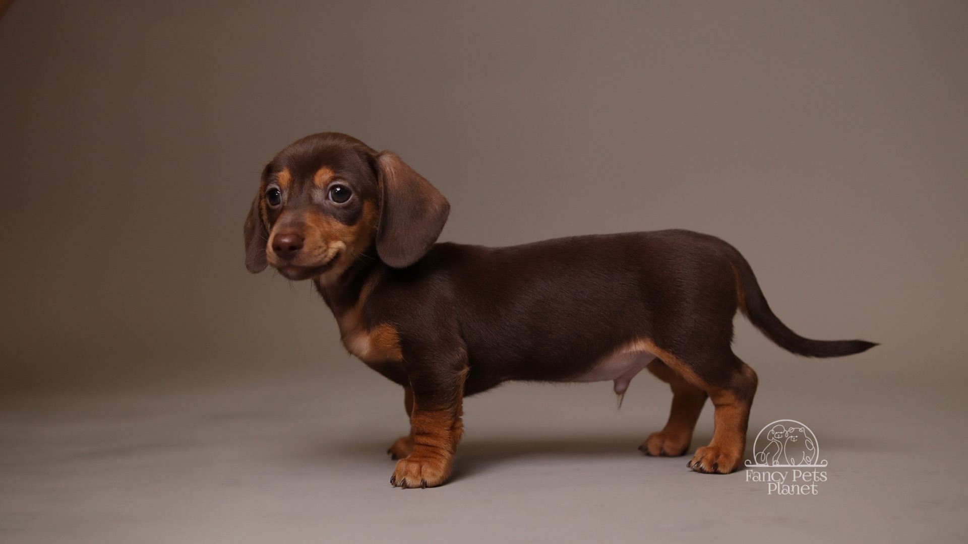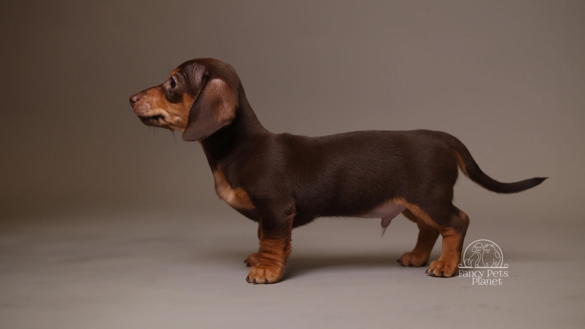 Alfie is an adorable AKC Miniature Dachshund boy with a sleek chocolate and tan short coat and striking blue-green eyes. He’s outgoing, affectionate, and loves attention, making him the perfect lap and play companion.