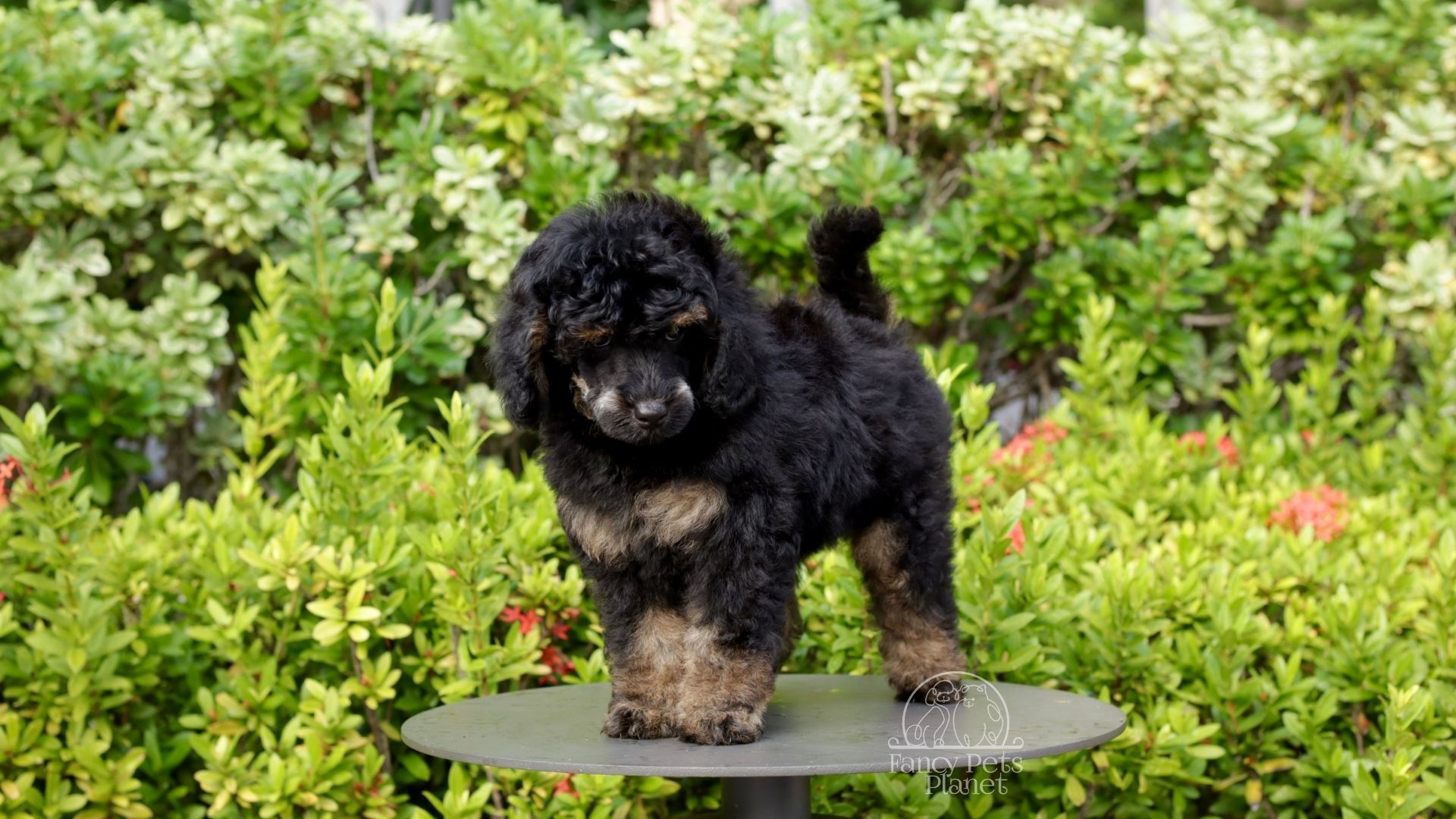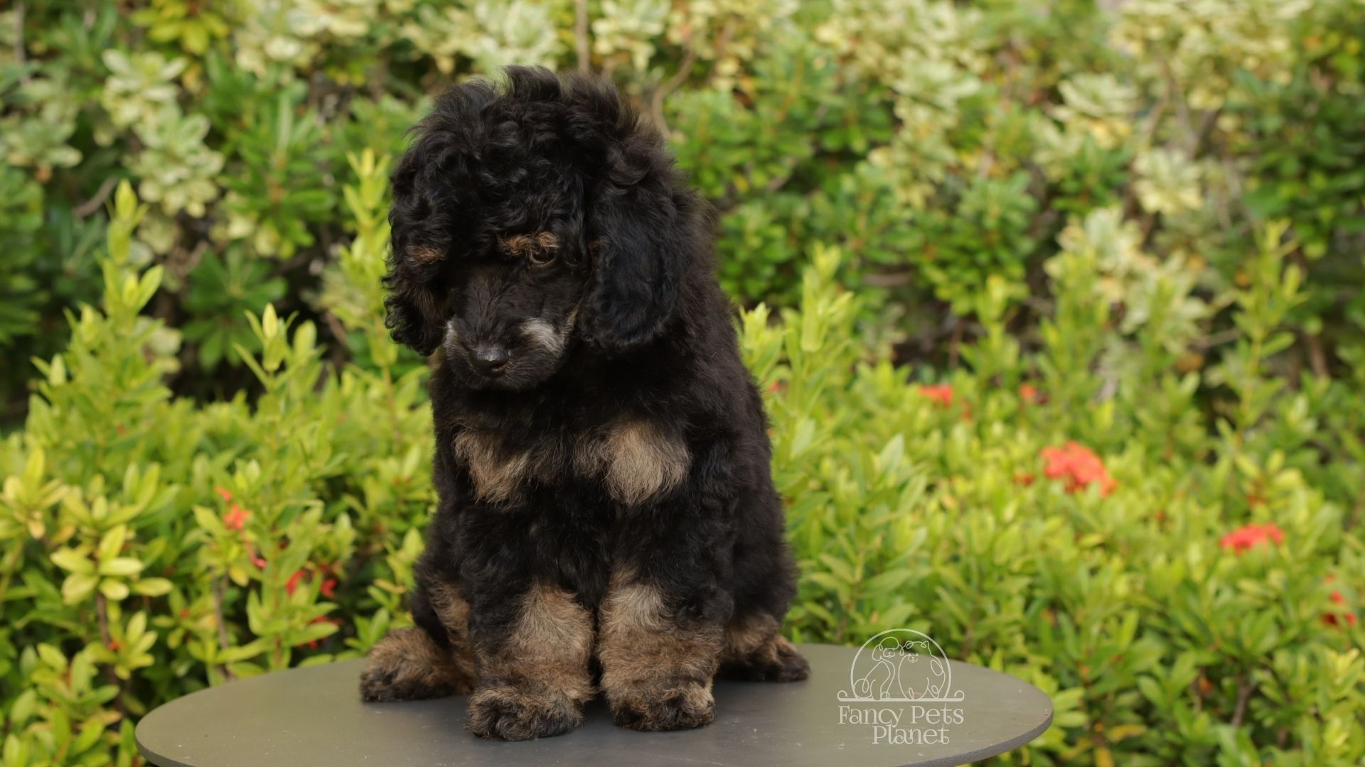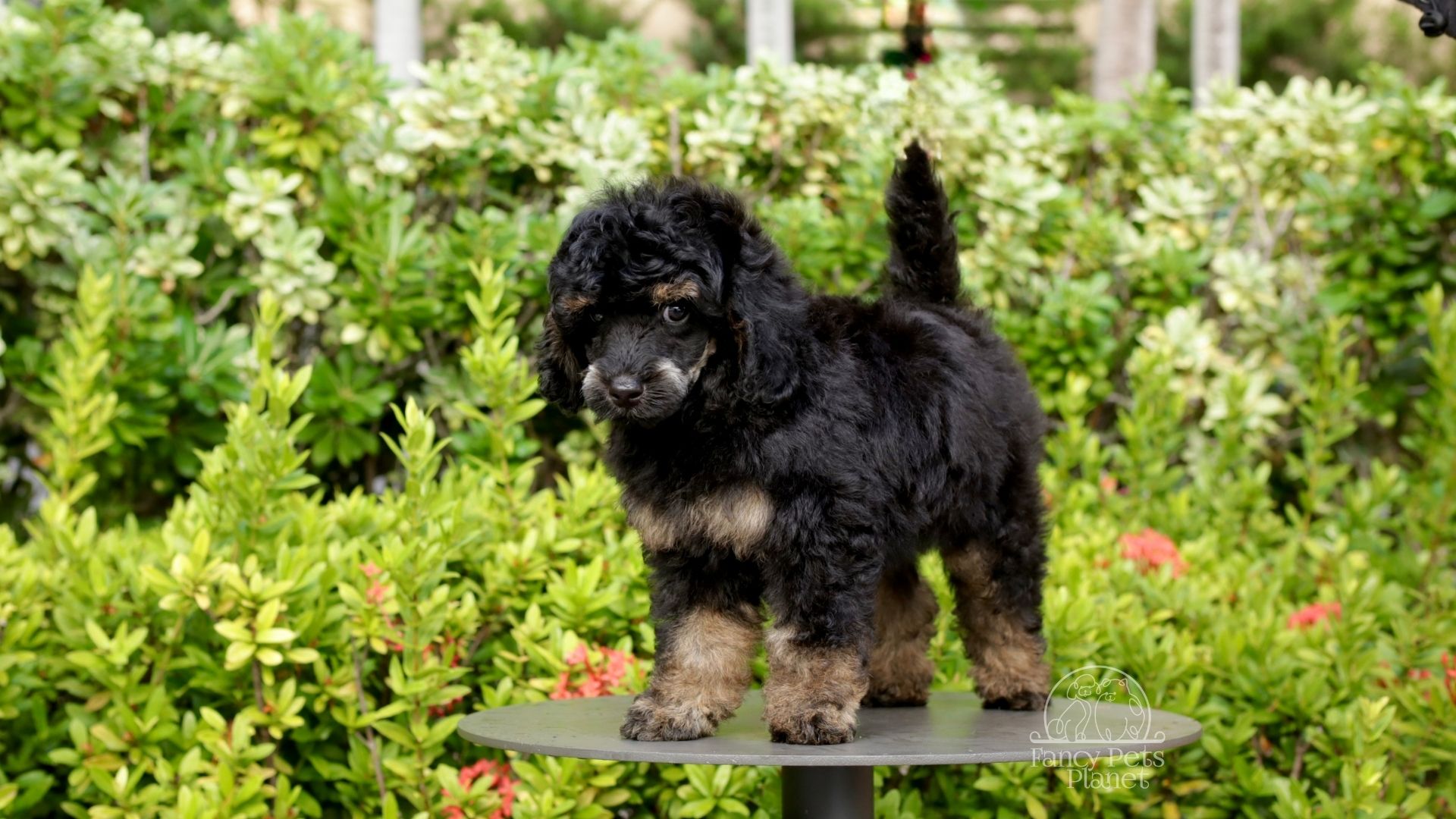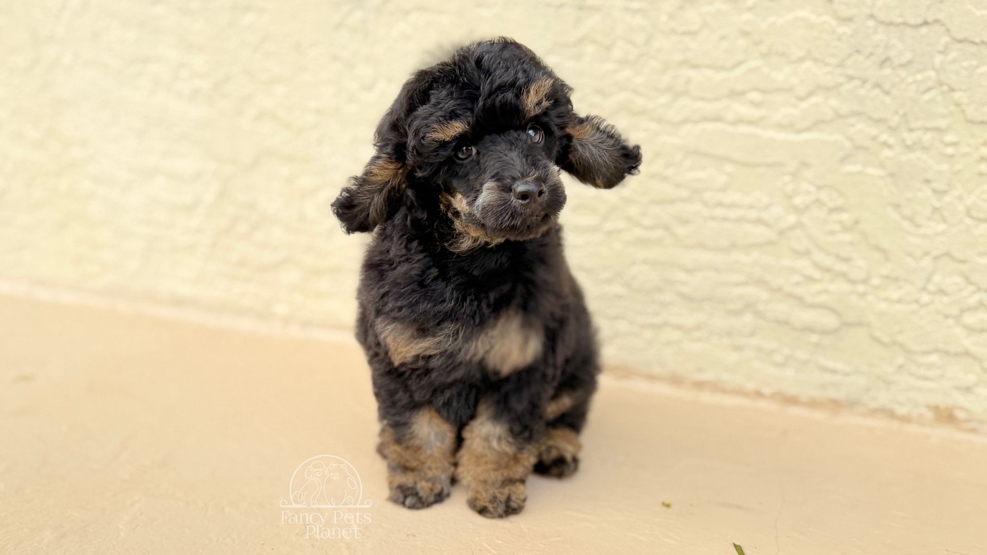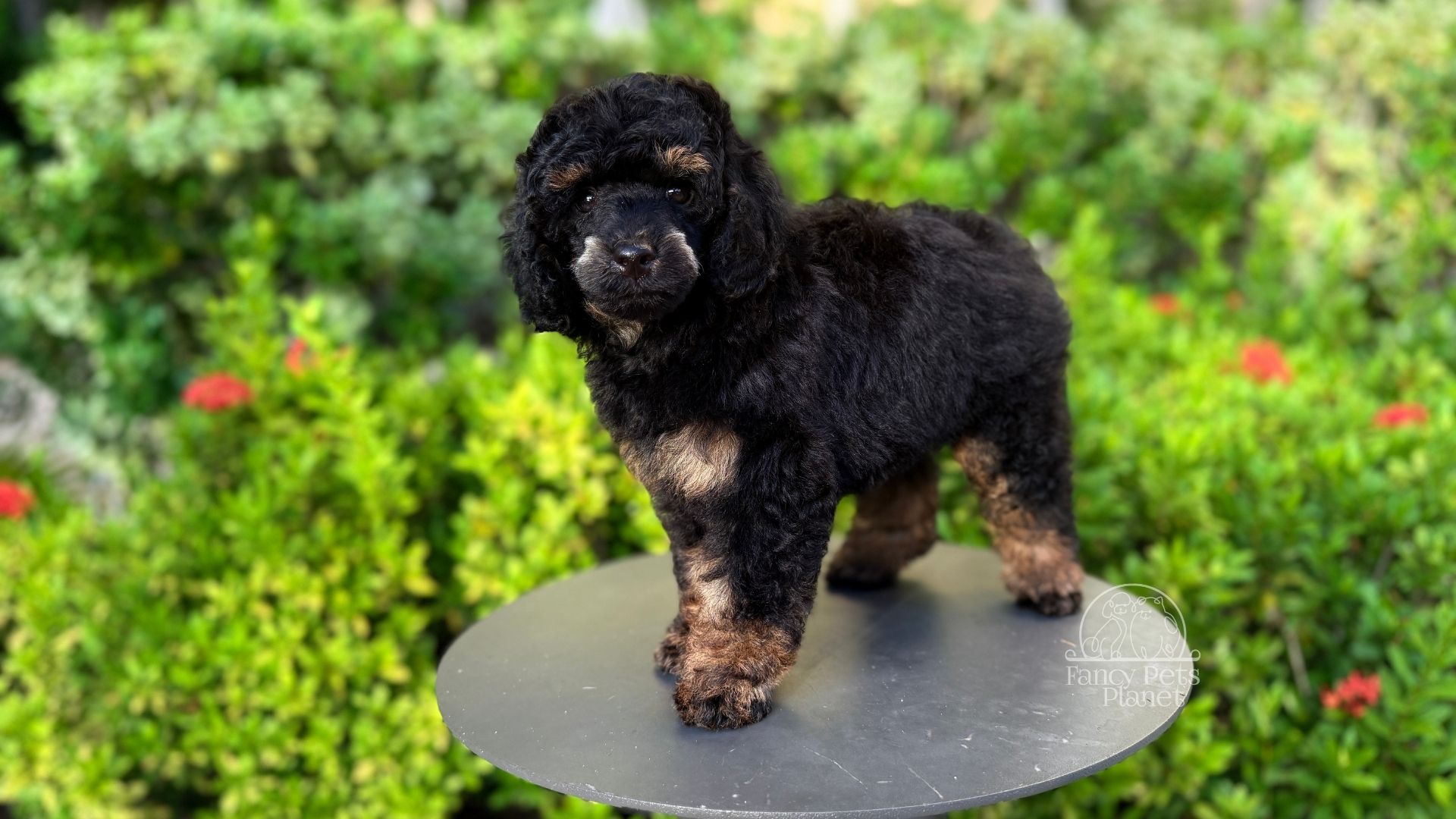 Meet Carlos, a beautifully marked black phantom Toy–Mini Poodle, estimated to reach up to 11 inches and up to 8 lbs full grown — the perfect in-between size for families. Not too big, not too small, right in that ideal range for a calm, affectionate companion.
