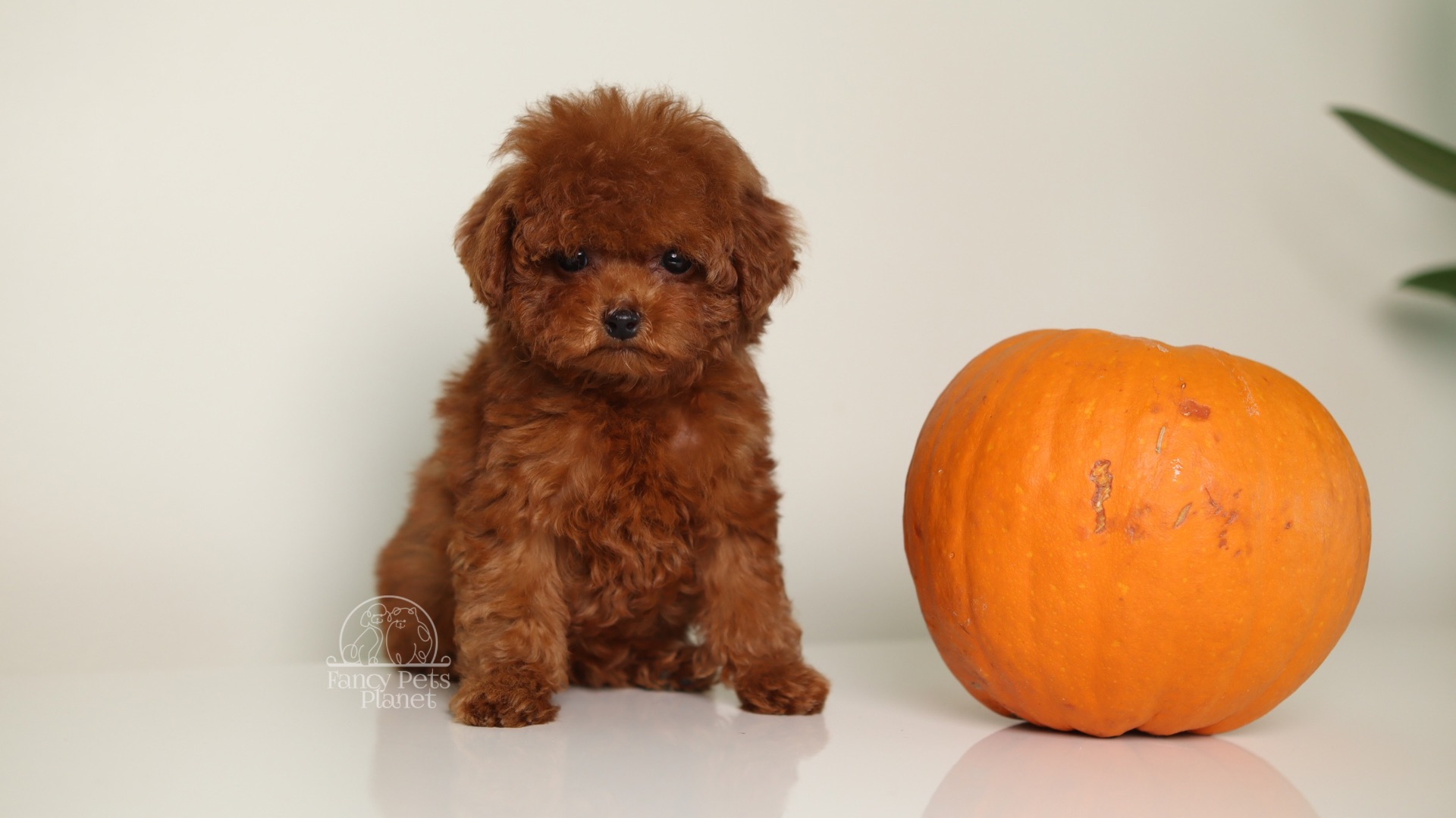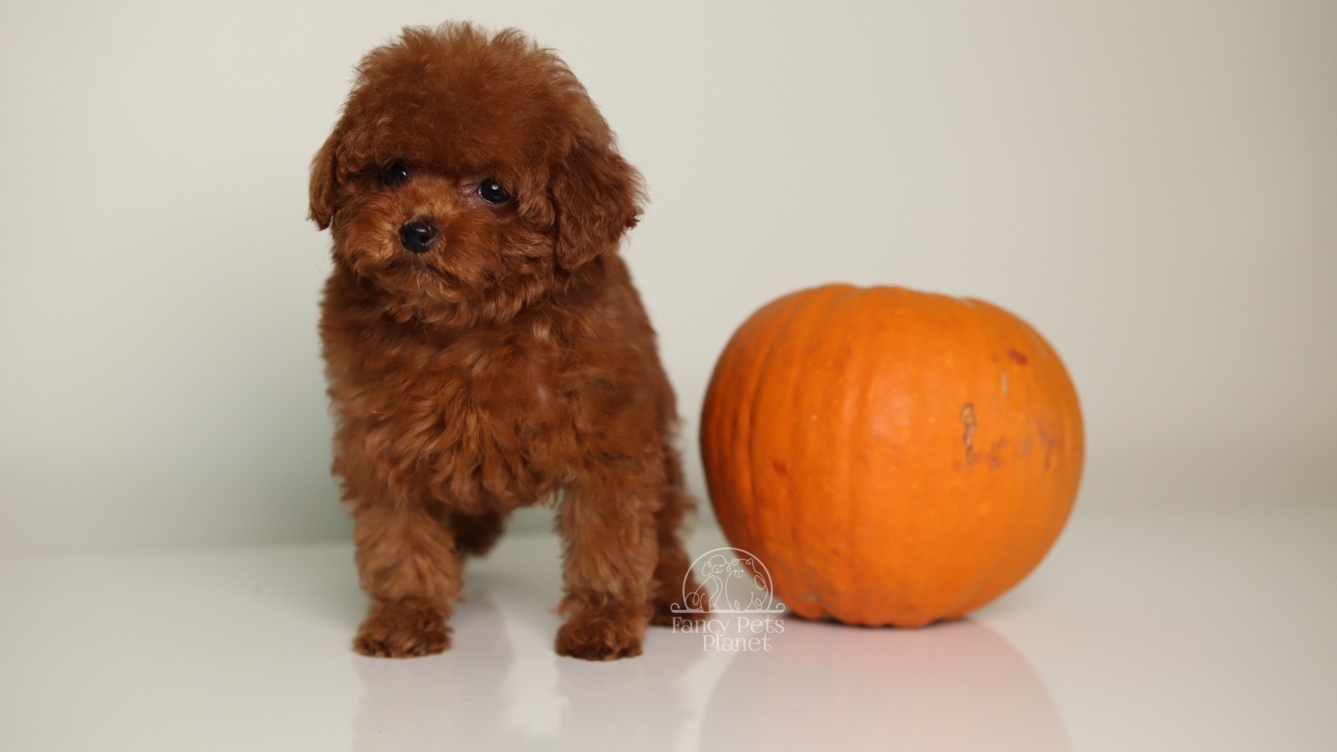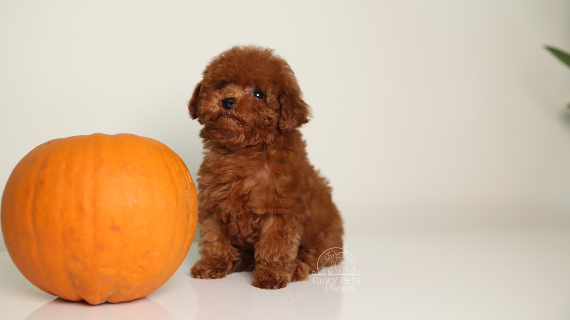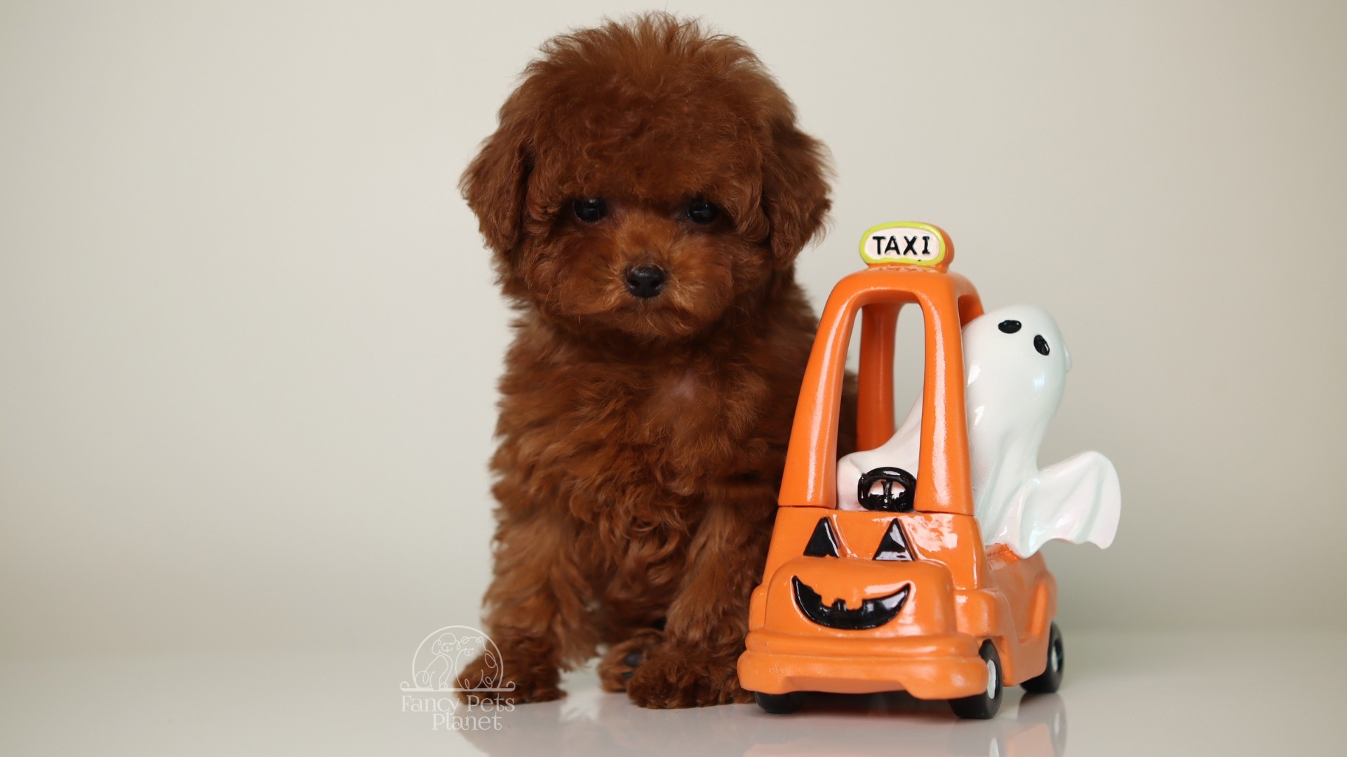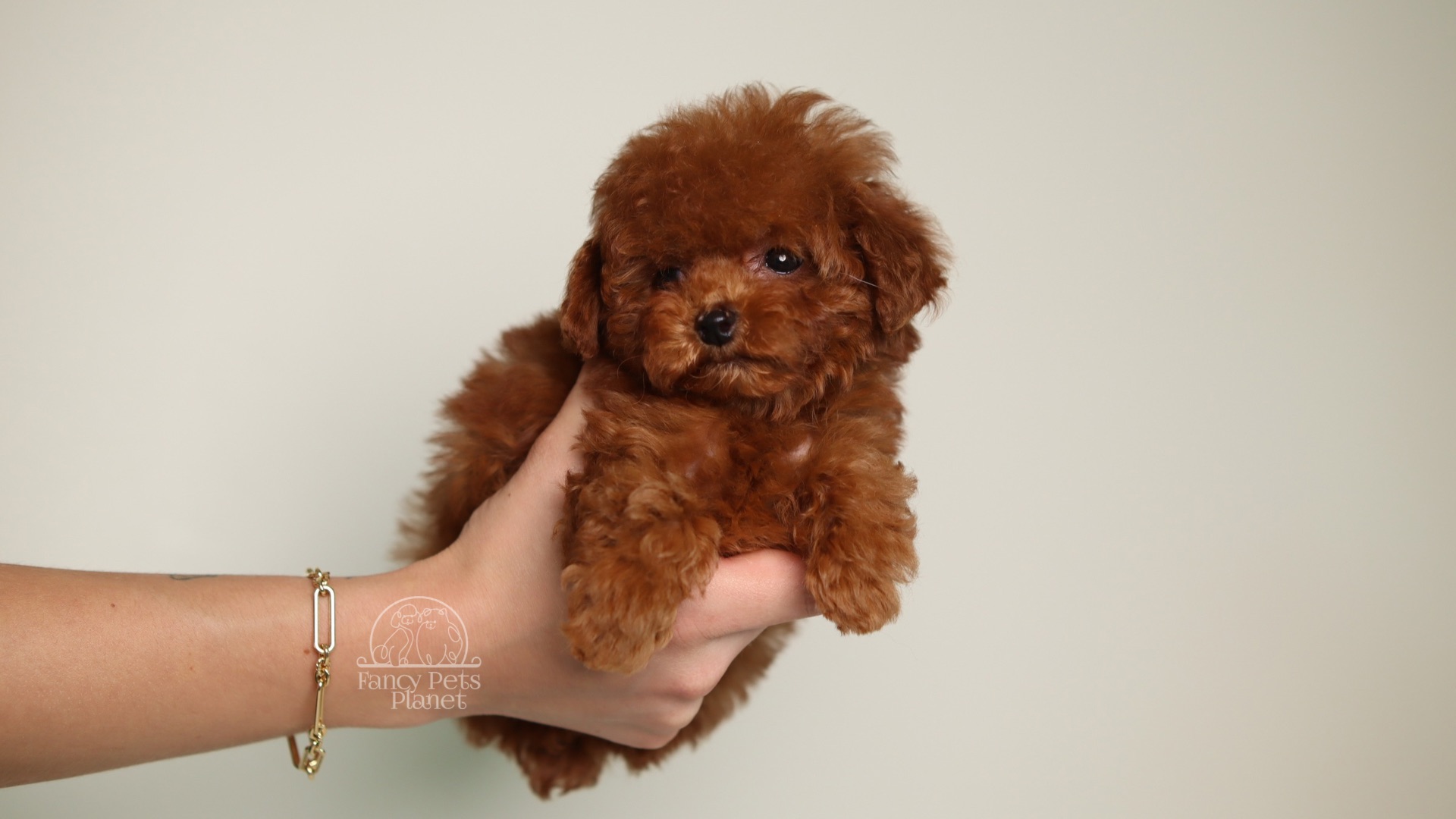 Juliet is an enchanting deep cherry red Chinese Teacup Toy Poodle Import girl with a babydoll face, short nose, and rich, plush coat. Estimated to reach around 7 inches and up to 4 lbs full grown, she looks like a real-life teddy bear plush come to life — so tiny, you’ll wonder if she’s moving or just too cute to be real!